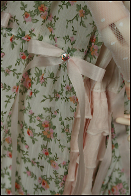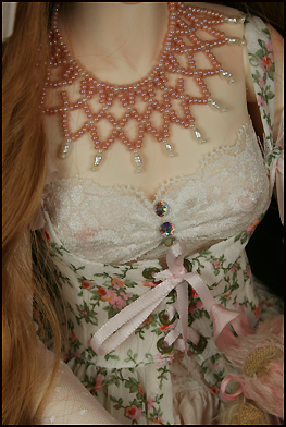 Tessa's dress is a rayon floral print embellished with bows and crystals surrounding the skirt .It has a silk underskirt with a ruffle panel in the front.The bodice is stretch lace with a crystal accent.The necklace is hand made with glass beads and water pearls. On her head she wears a head band with paper roses and silk bows. Her gloves are stretch nylon.