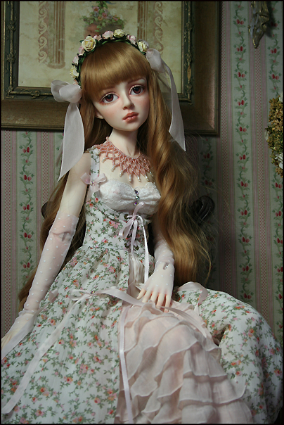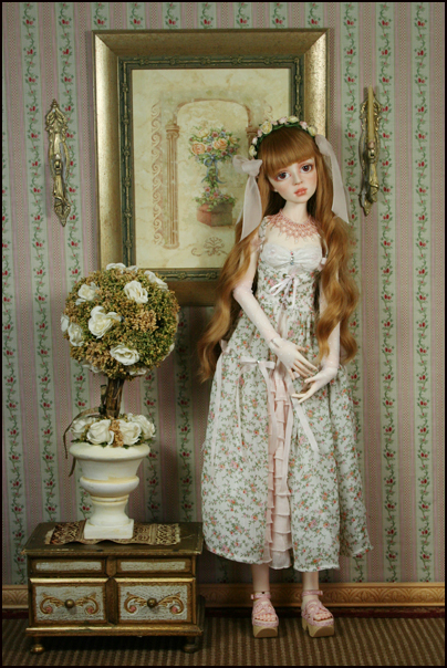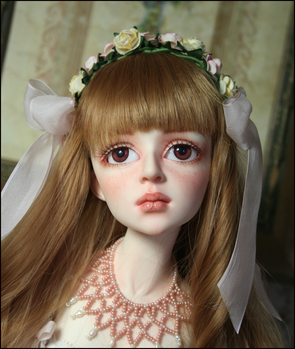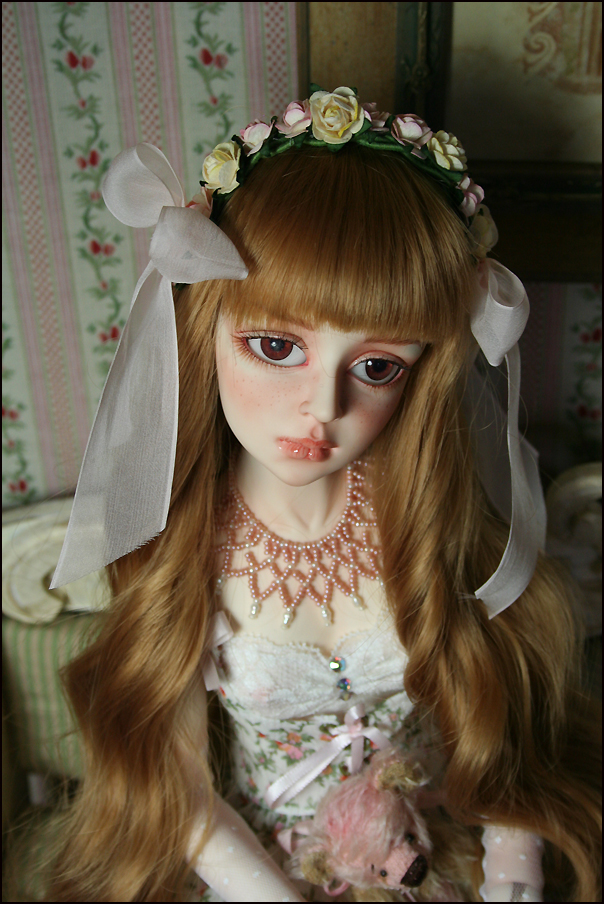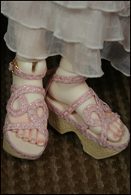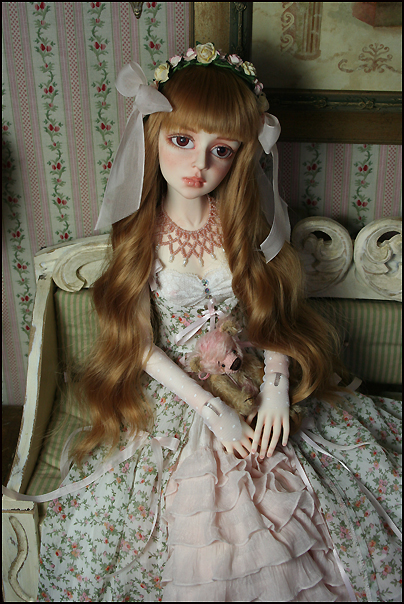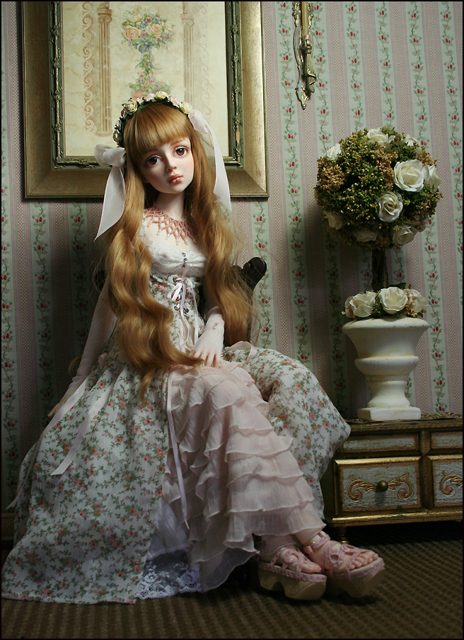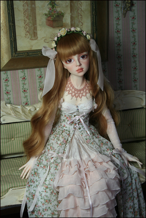 On her feet she wears shoes made by KZShoes (straw braid and poymer clay heels). Her wig is from For My Doll and eyes Eyeco-Platinun series.