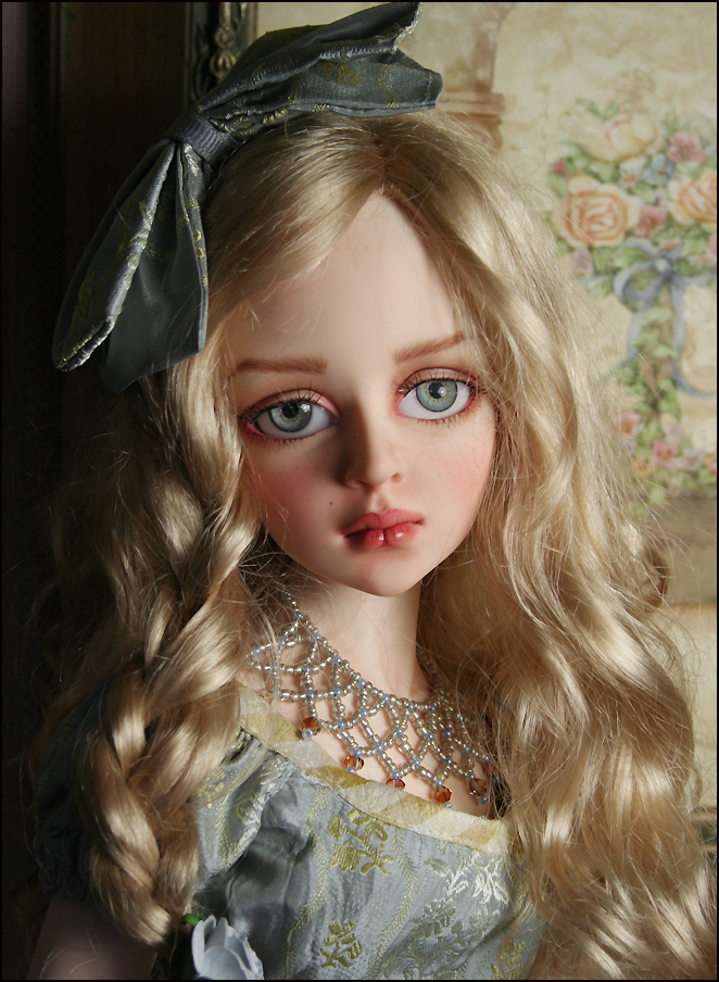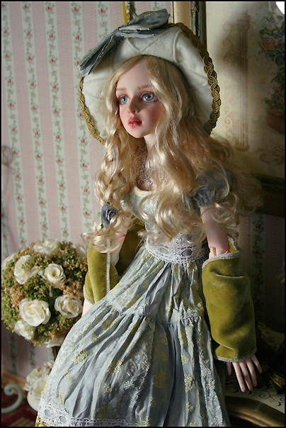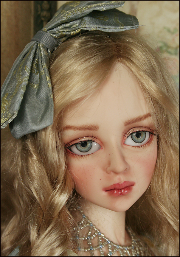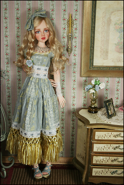 Tessa's dress is embroidered silk with a ribbon fringe around the hemline. Her stole is silk velvet with a tassel trim. She wears silk bloomers. Her necklace is handmade with glass beads and Swarovski crystal. Her hat is felt with a bow to match her dress. Her shoes are hand made by KZShoes (straw braid with polymer clay heel). The wig is Monique Gold and her eyes are Eyeco-platinum series.