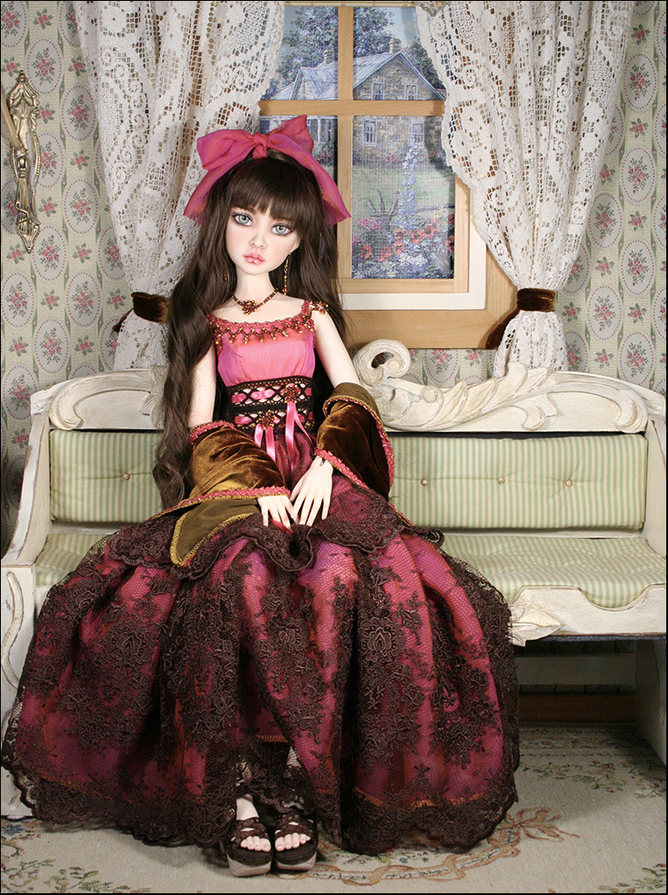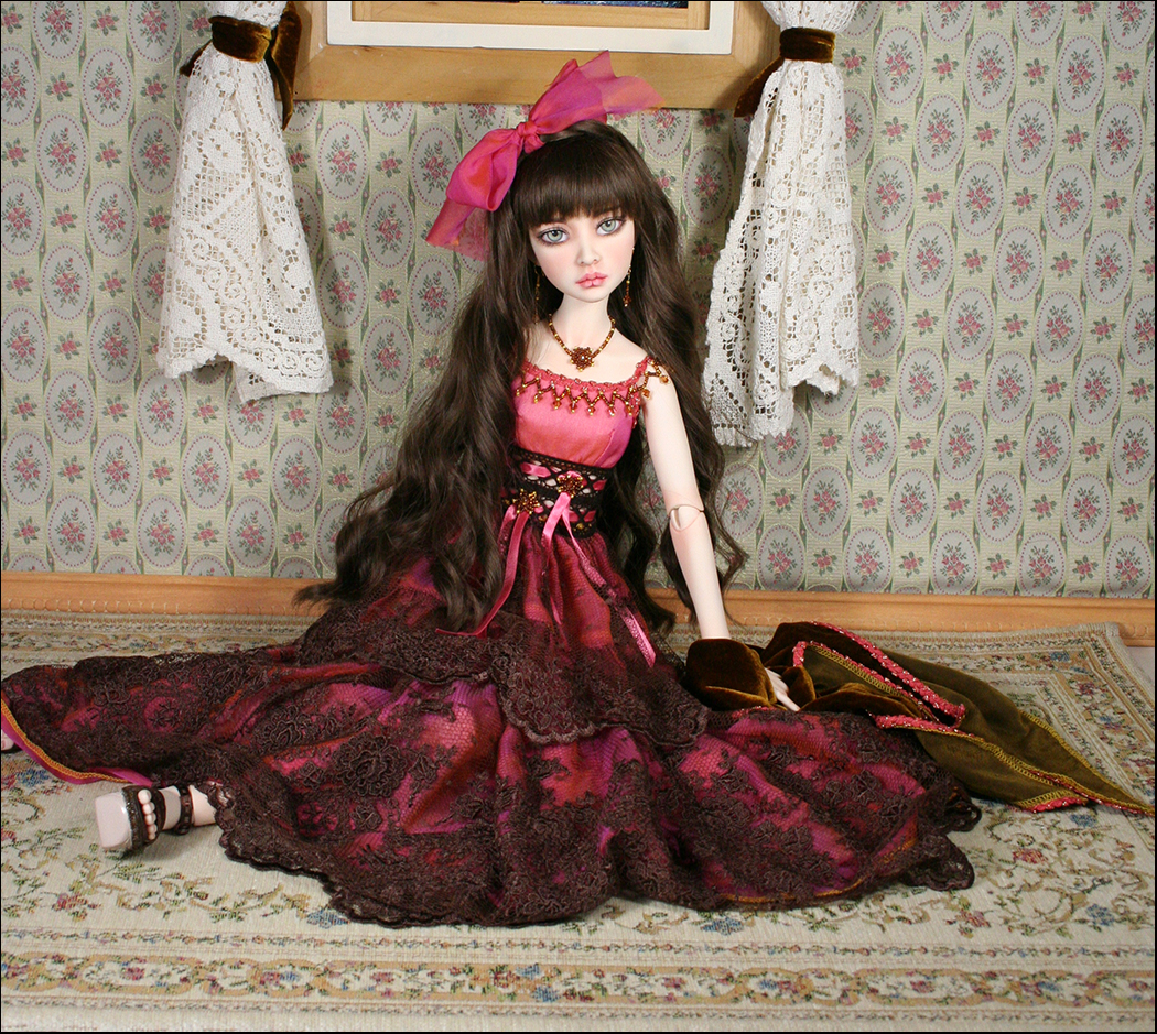 Her eyes are "Eyeco-Platinum Series", her wig is "For My Doll" and her sandals were handmade by KZShoes- (ribbon with polymer clay heels).