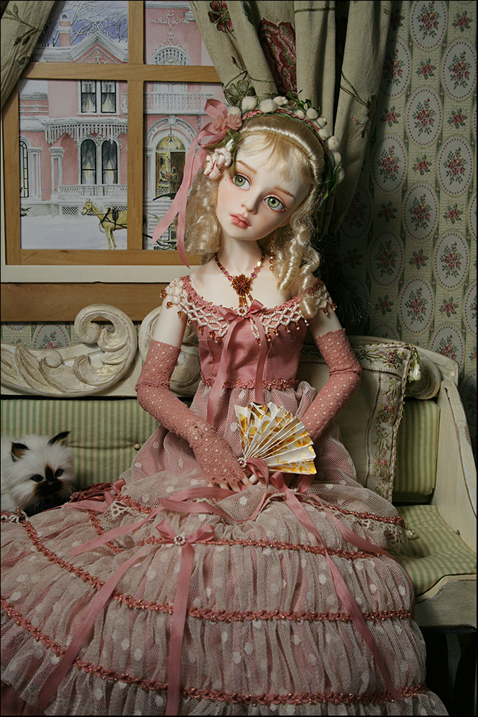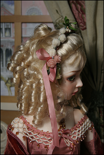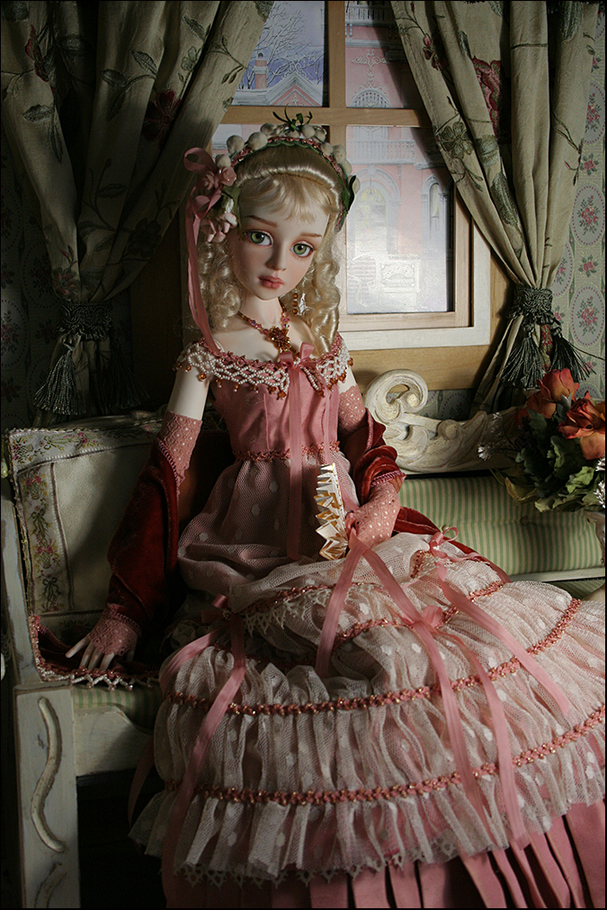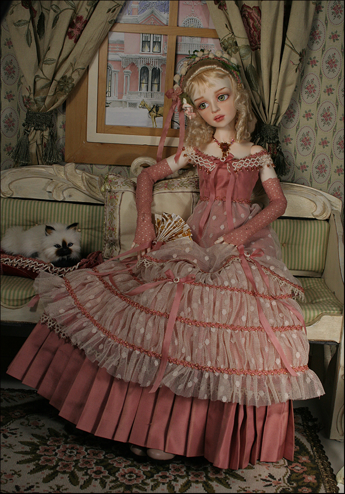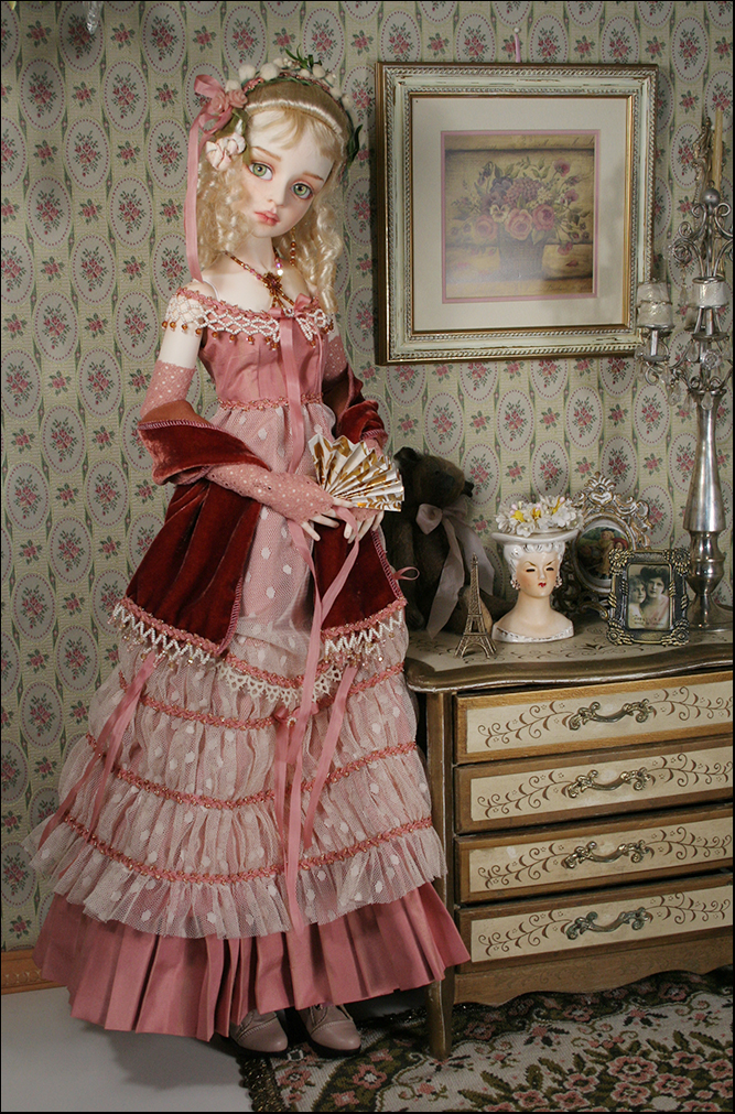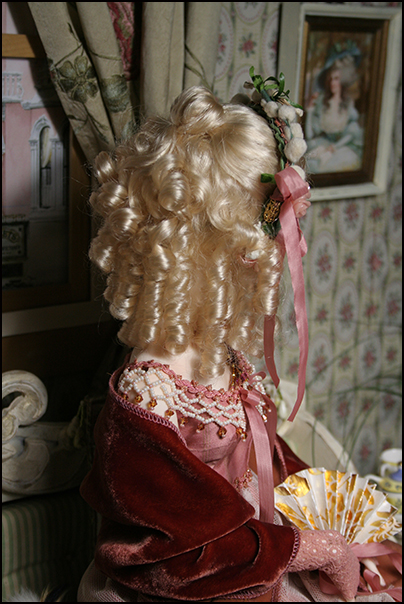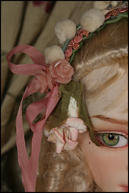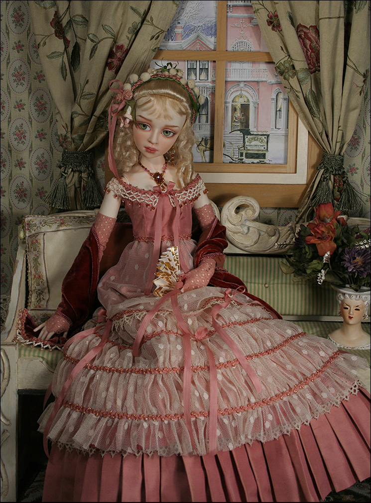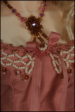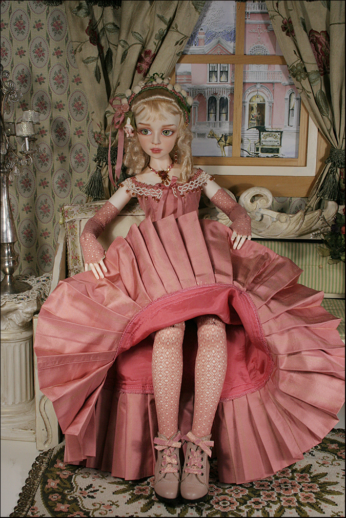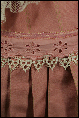 The over dress has a silk bodice with a beaded collar and gathered netting skrit (lined). The under skirt is the same silk as the bodice and has a pleated flounce (lined). She wears matching gloves and leggings.