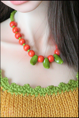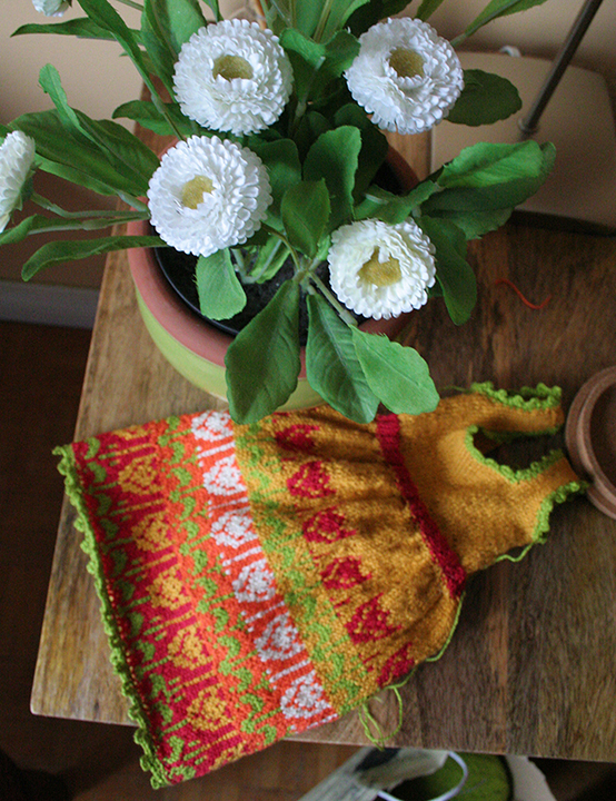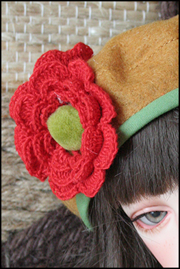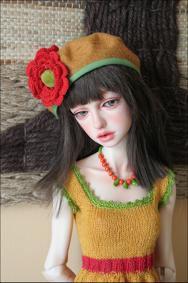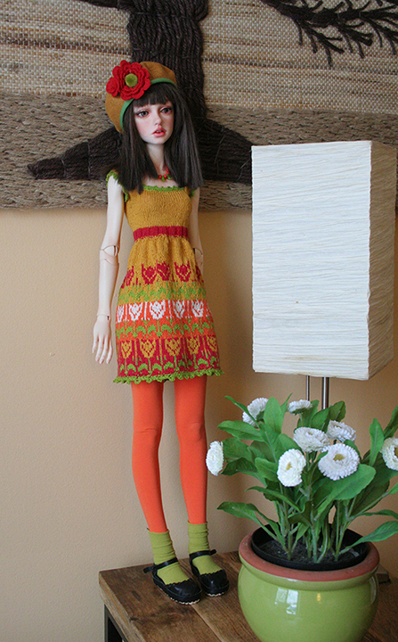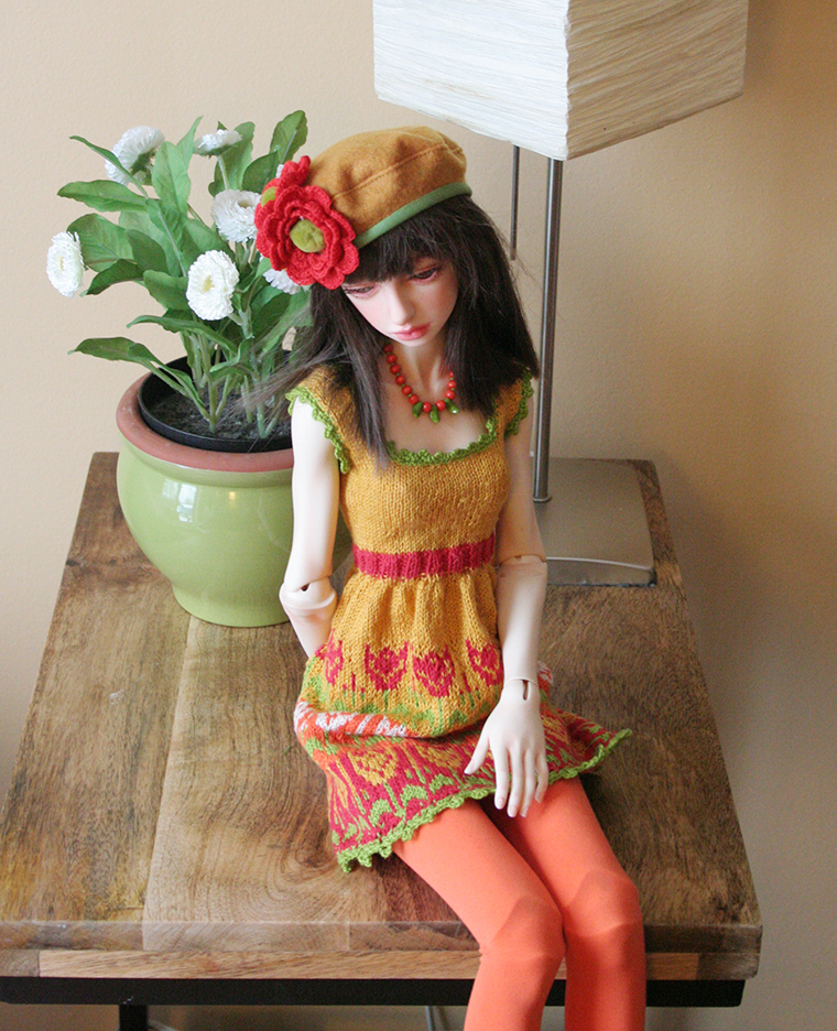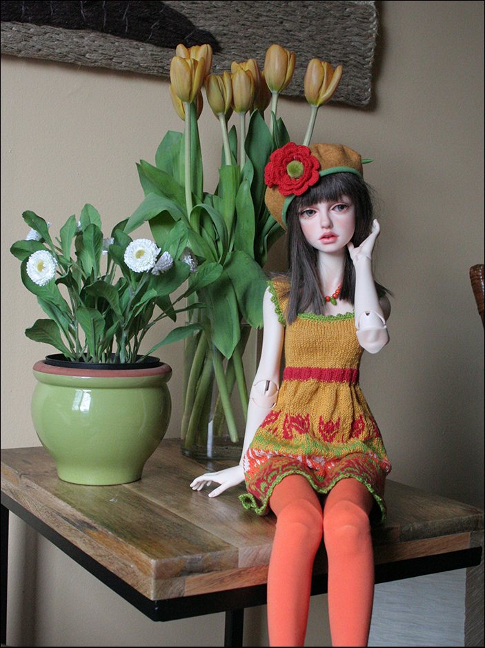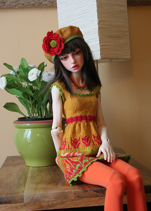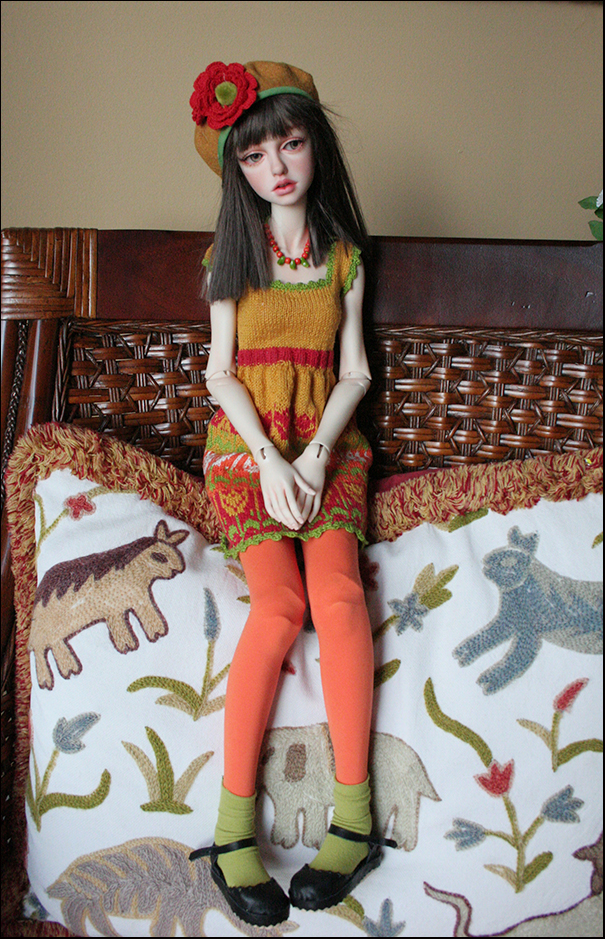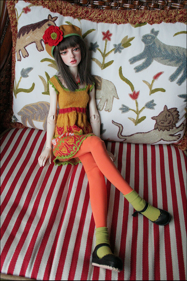 This dress is hand knit by me. I love to knit although it is so time consuming I fine it relaxing and the outcome very special. The yarn is Italian cotton. Her hat is felt with crocheted flower. Her leggings and socks are stretch knit. Her necklace is wood and glass beads.