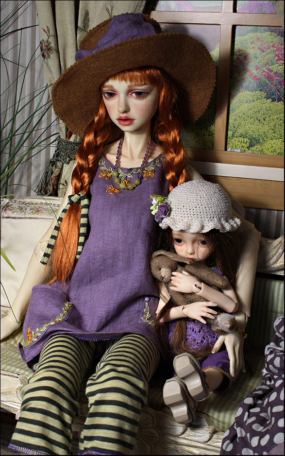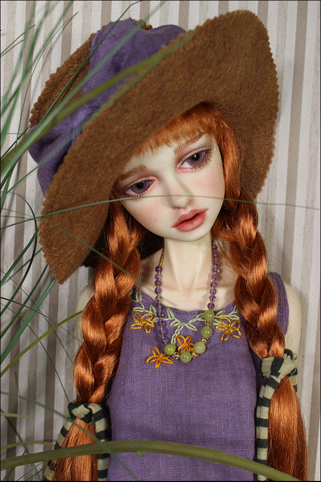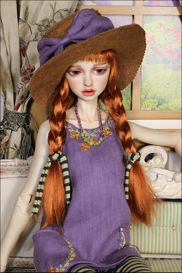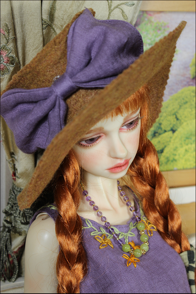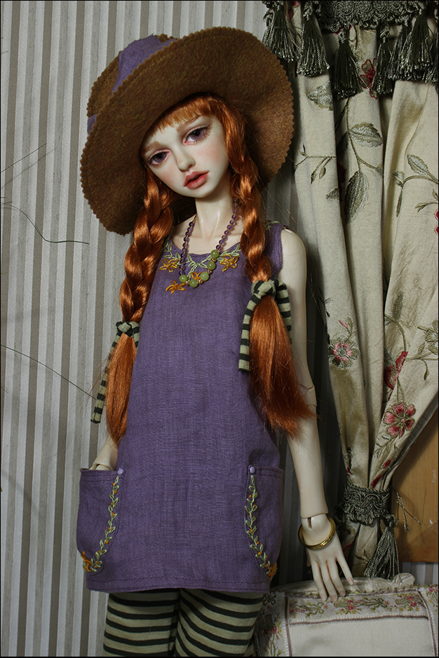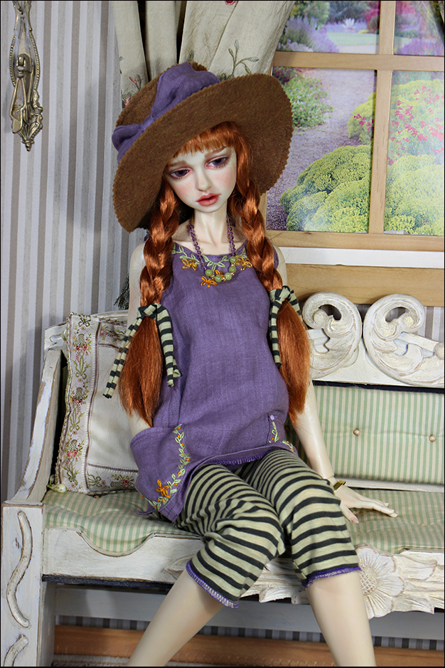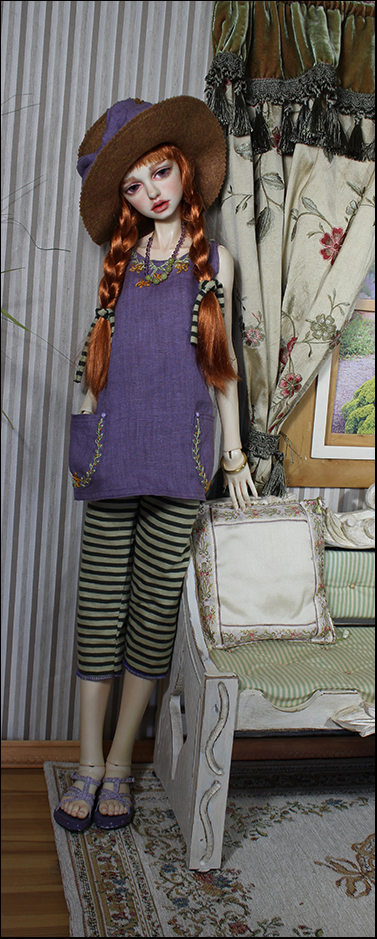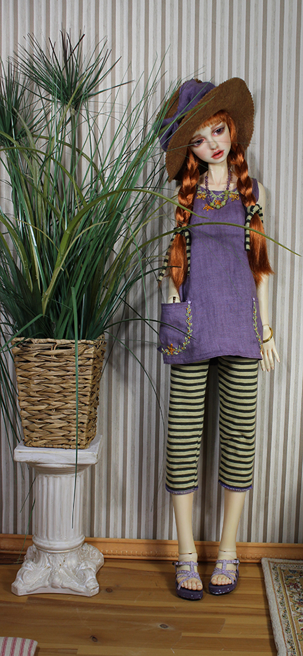 Outfit includes: embroidered linen top, stretch pants, felt hat with linen bow and jade and amethyst beaded nacklace.
