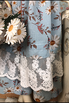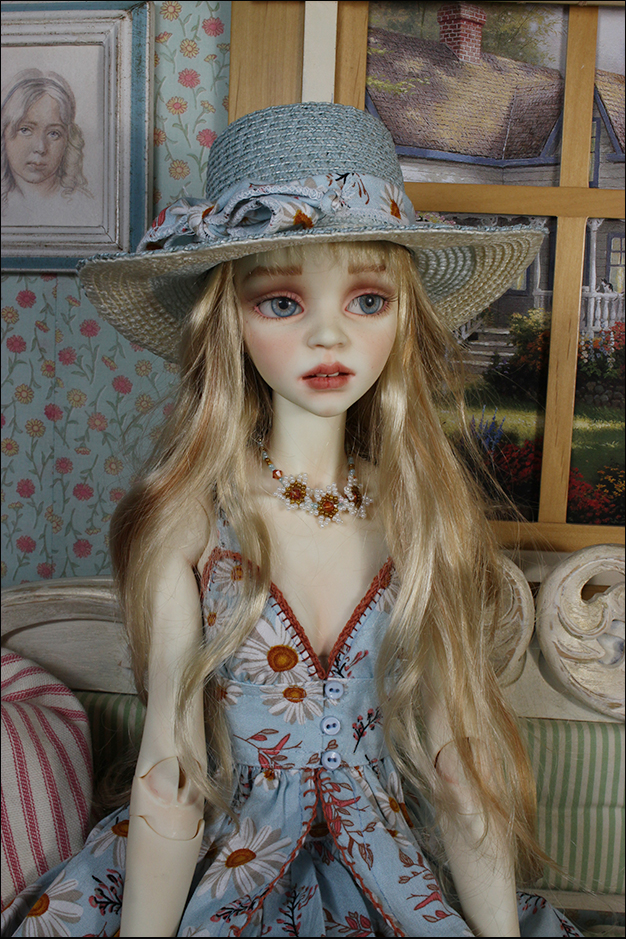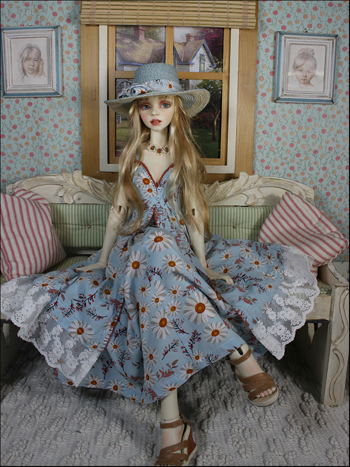 Outfit includes: Rayon dress with front opening and blanket stich accent, matching underskirt, straw hat with tie and beaded necklace.